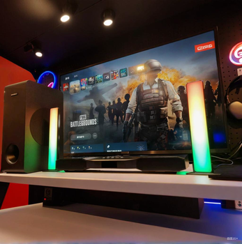 RGB 조명 오디오 동기화 서라운드 사운드 BT 5.3 HD-ARC AUX USB 서브 우퍼가있는 스마트 TV 2.1CH PC 게임용 사운드바